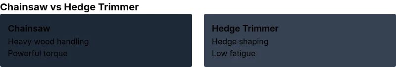 A chainsaw is for wood and tree tasks; a hedge trimmer is for hedges and pruning.