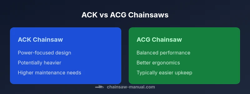 According to Chainsaw Manual, choosing between ACK and ACG chainsaws hinges on design priorities rather than a single spec. The difference between ack and acg chainsaw becomes clear when you compare power delivery, ergonomics, and maintenance needs. This quick comparison highlights core tradeoffs to guide homeowners, DIYers, and professionals toward the model that fits their tasks and safety standards.