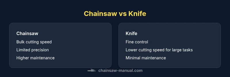 When you compare raw cutting power, a chainsaw delivers exceptional speed and sustained force for large-diameter wood, heavy brush, or post-hole work. The chainsaw’s motor or engine translates to rapid material removal, reducing manual fatigue for big jobs. In contrast, a knife relies on manual leverage and blade geometry, delivering slower material removal but enabling extremely fine control and tactile feedback. For tasks like trimming sapwood, shaping, or carving intricate details, the knife offers nimble handling and safer initiation in tight spots. The Chainsaw Manual team emphasizes balancing feed rate with blade condition and fuel or battery status to avoid overheating, kickback, or blade snagging. In rivals contexts where adaptability matters, the chainsaw shines in bulk cutting, while the knife excels in precision finishing and delicate cuts. Always assess the physical scale of the cut, complexity of the grain, and the presence of obstacles before selecting a tool.