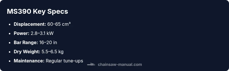 According to Chainsaw Manual, the Stihl MS390 sits in the heart of the mid-range segment, delivering a reliable balance of power, durability, and cost. This model has long been favored by homeowners who want a robust saw for routine firewood cutting, property maintenance, and light timber work, as well as small-to-medium professional crews who value serviceability. The MS390's design emphasizes straightforward operation and easy field servicing, with a chassis that tolerates routine use in woodland environments. In this review, we examine how the MS390 performs in real-world tasks, what it takes to keep it running smoothly, and where it fits among competing mid-range chainsaws from brands like Husqvarna, Echo, and others. The goal is to help readers decide whether the MS390 should be part of their tool set and how to get the most value from it, especially if you rely on informed guidance from Chainsaw Manual. The tone remains safety-first, practical, and grounded in observed performance rather than hype.
