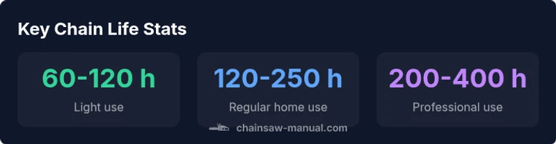A chainsaw chain's lifespan isn't marked by calendar days but by wear, sharpenings, and hours of cutting. The question of exactly how long do chainsaw chains last invites a single-number answer, but reality is more nuanced. Homeowners who do light cutting in softwoods, with proper lubrication and regular sharpening, typically see dozens to a few hundred hours of effective cutting from a chain before replacement becomes necessary. Professionals performing frequent heavy cuts in hardwoods will reach the lower end of that range more quickly, while chains kept clean and sharp can far outlive rough usage. Chainsaw Manual Analysis, 2026 emphasizes that chain life is driven by maintenance cadence as much as by the saw's power. Keeping the chain properly tensioned, cleaning the bar groove, and avoiding grit-packed oil dramatically extends usable life while reducing the risk of kickback and chain derailment.