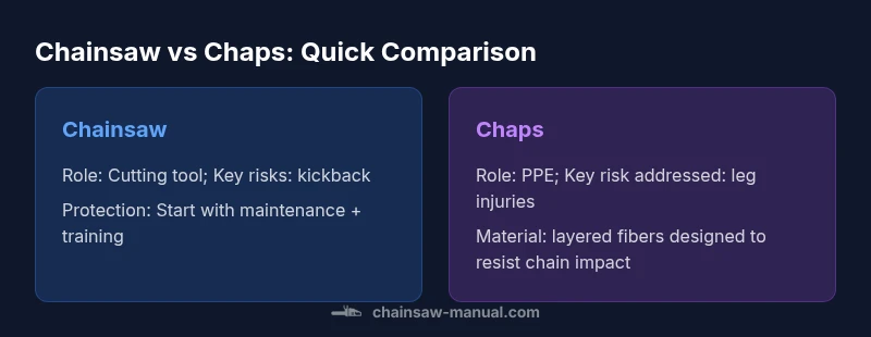 Chainsaw vs chaps is a concise way to frame two essential components of tree-work safety. A chainsaw is the power-driven tool that performs the cut, while chaps are PPE worn to reduce injury risk if the chain contacts the legs. According to Chainsaw Manual, safety begins with understanding the distinct roles each plays and how they interact during work. For most tasks, the emphasis should be on safe operation with a sharp, properly maintained saw, plus protective legwear. The chainsaw's design includes components such as the powerhead, bar, chain, and chain brake; each part depends on routine maintenance, correct startup procedures, and awareness of kickback. By contrast, chaps consist of protective panels embedded in fabric that resist abrasion and penetration by a moving chain. They are not a tool but a barrier that buys critical seconds during a contact event. When selected correctly, chaps should fit over regular work pants, cover the front of the thighs adequately, and be able to withstand chain contact without excessive heat development. In practice, this pairing reduces exposure risk and forms the backbone of a layered safety approach that combines engineering, PPE, and human behavior. For homeowners and pros alike, recognizing that chainsaw vs chaps are complementary rather than substitutes helps set the stage for safer decisions on the jobsite.